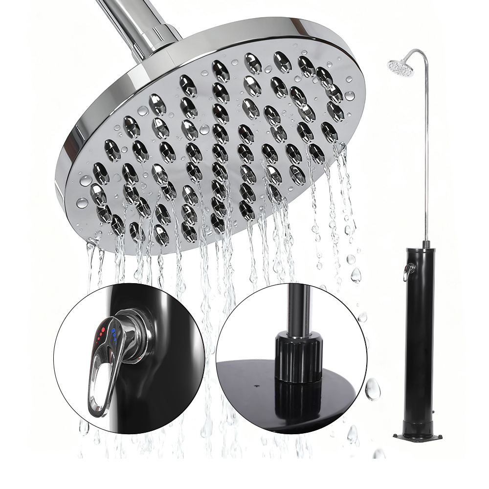 Woda w rurze prysznicowej o pojemności 18/20 litrów pod wpływem silnego światła słonecznego może w naturalny sposób nagrzać się do około 60°C bez konieczności korzystania z prądu, co stanowi wygodne i przyjazne dla środowiska rozwiązanie prysznicowe. Wystarczy podłączyć zwykły wąż ogrodowy, aby z łatwością napełnić rurę prysznicową. Wykonany z tworzywa sztucznego odpornego na promieniowanie UV, okrągły prysznic solarny do basenu ogrodowego LY18L01-B 18L został zaprojektowany z myślą o trwałości i można go łatwo zdemontować i transportować w razie potrzeby. Solidna podstawa ze stali nierdzewnej, PCV, ABS, miedzi i metalu zapewnia niezawodną stabilność, utrzymując urządzenie bezpiecznie na miejscu nawet podczas częstego użytkowania. Dodatkowo posiada standardowe złącze węża ogrodowego do szybkiego napełniania oraz korek spustowy, który pozwala na łatwe opróżnienie rury prysznicowej, co ułatwia przygotowanie prysznica do przechowywania zimą.