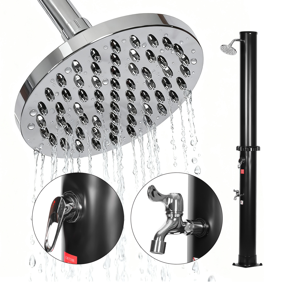 Ten ogrodowy prysznic solarny LY35L01 z rurą prysznicową o dużej pojemności został zaprojektowany z myślą o rodzinnym użytku na zewnątrz i wyposażony w rurę prysznicową o dużych rozmiarach, która może podgrzewać wodę do około 60°C w jasnym świetle słonecznym, bez konieczności stosowania prądu. Wystarczy podłączyć standardowy wąż ogrodowy do napełnienia rury prysznicowej i każdy może cieszyć się orzeźwiającym prysznicem w ogrodzie, przy basenie lub na polu namiotowym. Dla większej wygody posiada wbudowaną metalową tackę, na której można przechowywać żel pod prysznic lub inne drobne przedmioty w zasięgu ręki, a otwór drenażowy na spodzie zapewnia płynny przepływ wody i zapobiega jej zastojom. Gdy nie jest używany, prysznic można łatwo zdemontować, co pozwala na kompaktowe przechowywanie, co czyni go praktycznym do użytku sezonowego lub transportu w inne miejsca.
